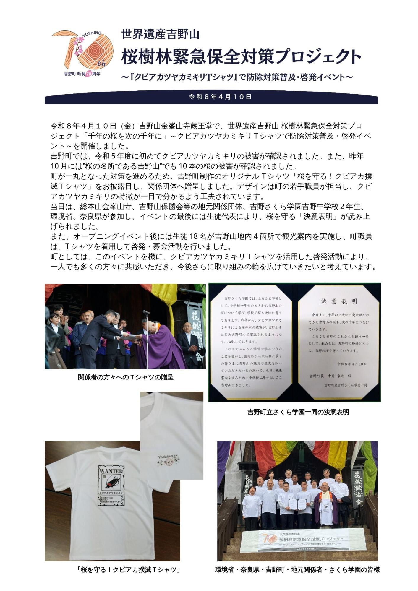 世界遺産吉野山 桜樹林緊急保全対策プロジェクトが開催されました 更新日:2026年04月16日 ページID : 1950 この記事に関するお問い合わせ先 吉野町役場 暮らし環境整備課 環境対策室〒639-3112 奈良県吉野郡吉野町大字立野767番地の2電話:0746-32-9024ファクス番号:0746-32-8097お問い合わせフォーム